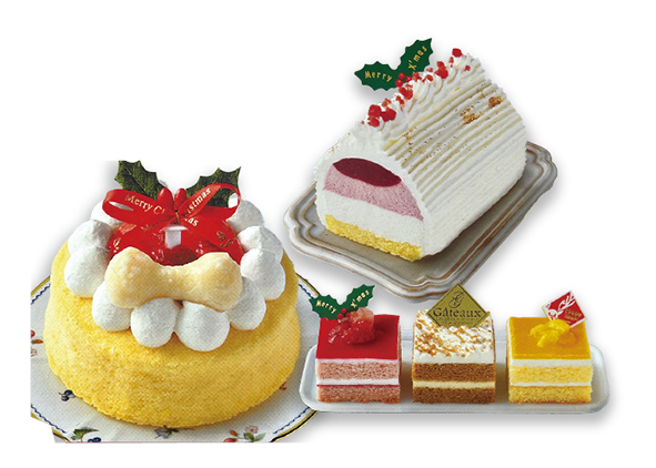 チーズスフレ 2,178円、ブッシュドノエル 2,178円、プチケーキアソート 2,178円