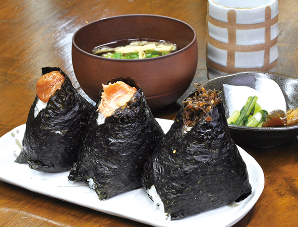 天然氷のかき氷で人気のカフェにおにぎりが登場。米どころつくばの優良米、新米で約40種。うめ、しゃけは350円、おむすび昆布は400円。味噌汁とお新香のセット350円もどうぞ。