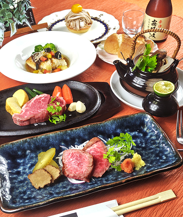 オードブル盛合せ、本日のスープ、ステーキ or ビーフシチュー、ライス or パン、デザート、ドリンク