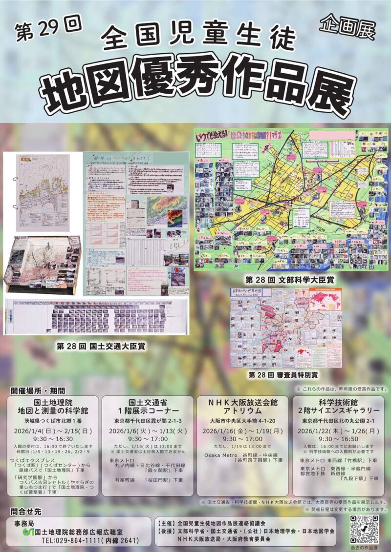 全国各地の団体が主催する、児童生徒の地図に関する作品展の中から選考した、国土交通大臣賞、文部科学大臣賞、審査員特別賞及び奨励賞の作品を含む、81作品の優秀な作品を展示。
