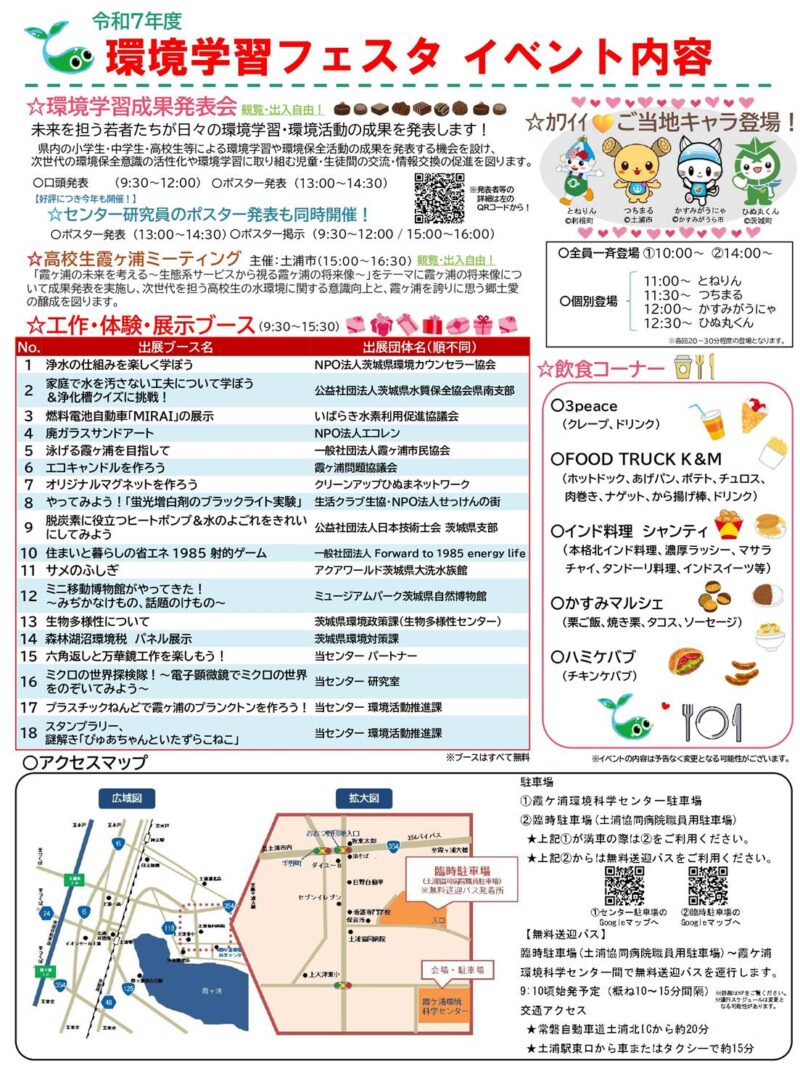 環境保全活動に取り組む市民団体をはじめ、多数の団体が工作・体験・展示等に関するブース出展を行い、環境や科学について楽しく学べるほか、県内の小学生・中学生・高校生が日頃取り組んでいる環境学習や環境保全活動について発表する「環境学習成果発表会」を実施。