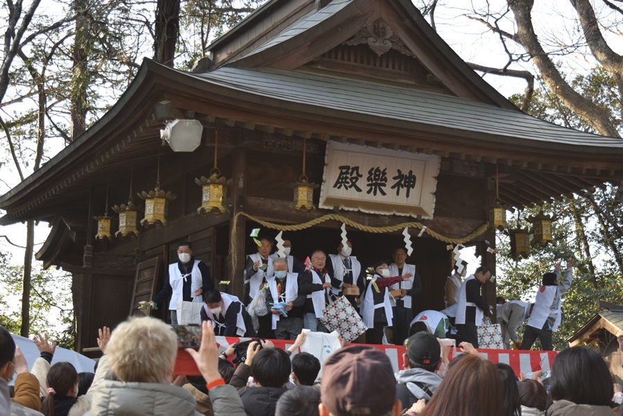 昼の部は、14:00から拝殿にて神事が始まり、最後に神楽殿より撒豆行事を行う。豆の他、紅白餅や菓子・即席麺などが撒かれる。19:00からの夜の部では、大相撲高砂部屋の高砂親方も撒豆行事司を努める。
