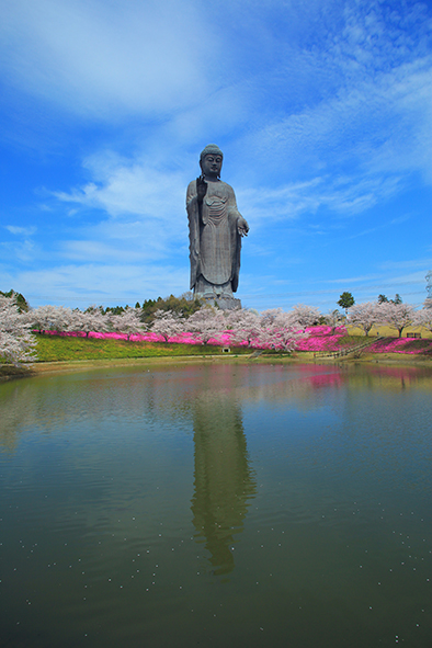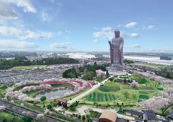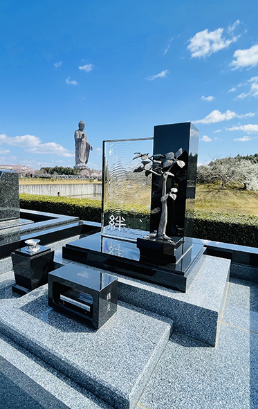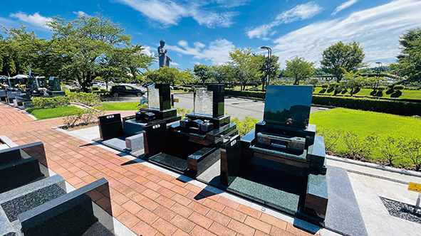 現在は、牛久大仏を背景に望める新区画も受付中。広い空と大仏の景観を体感できる立地は、この場所ならではといえる。
