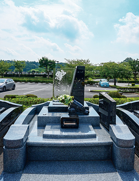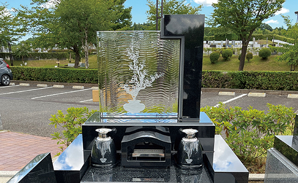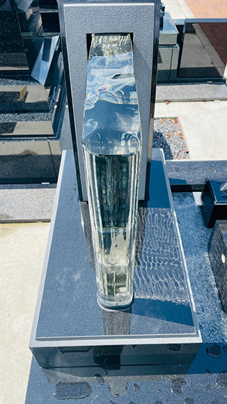 使用しているのは厚さ約10cmの無垢ガラス。高い透明度を持ちながら、屋外環境にも耐えられる強度を備える。晴れた日には光を受けてきらめき、角度によって印象が変わる。石のお墓に囲まれた中でも自然に調和し、景観の一部のように佇む姿が印象的だ。
