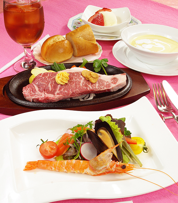 オードブル盛合せ、本日のスープ、ステーキ or ビーフシチュー、ライス or パン、デザート、ドリンク
