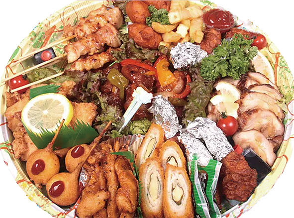 つくチキの人気商品を盛り合わせたオードブルはお年寄りからお子様まで楽しめる。2,700円・3,672円・4,104円の3種類から。※オードブルは前日までに予約。