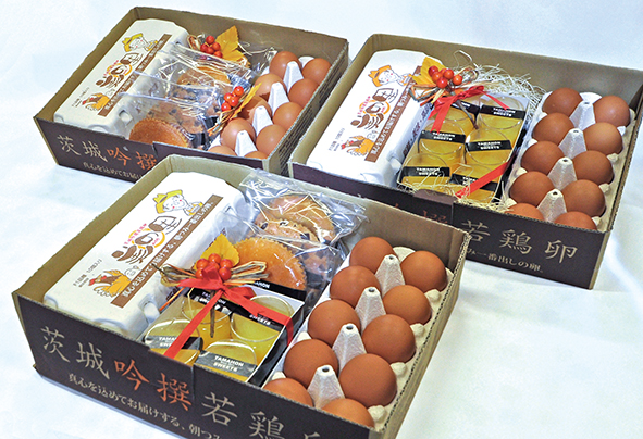 飼料にこだわったビタミンたっぷり、自社養鶏農場の朝採れたまごをその日のうちに販売。「美の里」ギフト12個600円〜、小玉20個580円〜。手作りのたまごのスイーツで小せがれプリン250円、マドレーヌ250円〜、スポンジケーキ350円〜どれも大人気。つくば店ではたまごとスイーツの組み合せギフトセット2,360円〜も販売。風呂敷100円。お年賀にいかが。